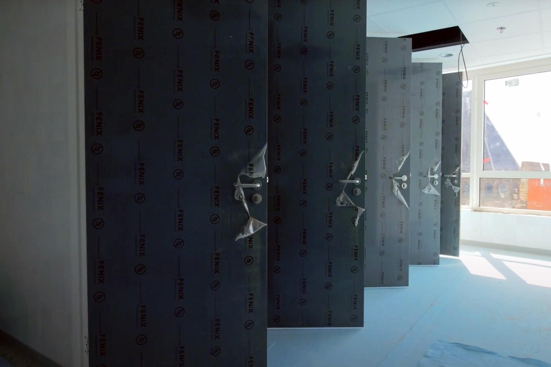Theuma leverde voor de Lee Towers zo’n 2500 deursets voor 840 appartementen van 40 tot 70 vierkante meter. We zochten de meest geschikte deursets en kozen voor afgelakte krasvaste EBC-deuren met stalen MonoPlus-montagekozijnen (stomp model). Daarnaast plaatsten we 42 schuifdeursets, waarbij de deur openschuift in de wand (type SIW–Utiliteit).